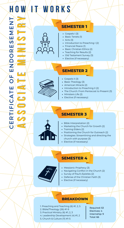 Advance Center for Ministry Training will award certificates for a variety of levels of accomplishment and excellence. In life preachers must have innate (God-given) traits of personality and leadership, usually recognized by others. However, plumbers, electricians and other trades usually require certification for varying degrees of proficiency. Even welders must be certified. Why not preachers and other ministers? We offer a Certificate of Endorsement in the following three ministry areas: (1) Preaching Ministry; (2) Associate Ministry; and (3) Practical Ministry. We also offer the Certificate of Completion designed for church members.